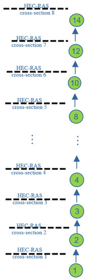 A segment length of 500 m was used for modelling. This length is deemed appropriate based on processing times, a reasonable uniform volume for segments, and an acceptable mixing. Benthic segments were inserted underneath each section of surface water to quantify erosion and sedimentation. The measured concentration at the upstream and downstream boundaries was used to calibrate the deposition rate of metals. In the HEC-RAS model, the spaces between each pair of cross-sections were split into individual WASP segments. Output files of the hydrodynamic model (HEC-RAS) were specific for each cross-section. These results then needed to be averaged between two consecutive cross-sections to obtain the exact values for each WASP segment. This procedure is shown in Figure 2 and was implemented in Microsoft Excel (Version 2211) for all input values.