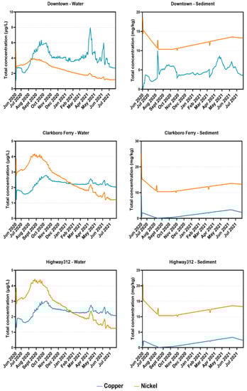 First, it was assumed that the deposition rate for copper and nickel should be the same as sediment. Deposition rates for copper and nickel were calibrated using the sampled concentration at the upstream and downstream model boundaries (Figure 3). A previously developed model for sediment transport was used, and the model was calibrated with an acceptable range of deposition [38]. Concentration plots (Figure 4) show the trend for both trace metals at selected sampling sites (Downtown, Clarkboro Ferry, and Highway 312) for both water and sediment samples. Concentration values for all sites can be found in the Supplementary Information.