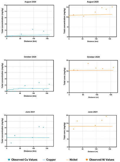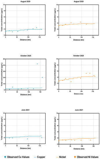Longitudinal profiles for nickel (Figure 5 and Figure 6) followed almost the same trend as those for copper, with very little variability in concentration values during the different sampling time points. Nickel concentrations remained consistent for August 2020, October 2020, June 2021, and August 2021, with a slight gradual increment with every major segment (i.e., sampling station). The concentration values followed a similar trend of gradual increase. For sediment samples, the modelled progressions again followed similar patterns in August 2020, October 2020, and June 2021, with a consistent and slight decline throughout the study area. Again, high flow in 2020 could explain the three- to fourfold greater nickel concentrations in 2020 compared to 2021 water samples. Similarly, for sediment samples, settling and transverse mixing can contribute to consistent and slight declines in the concentration values.