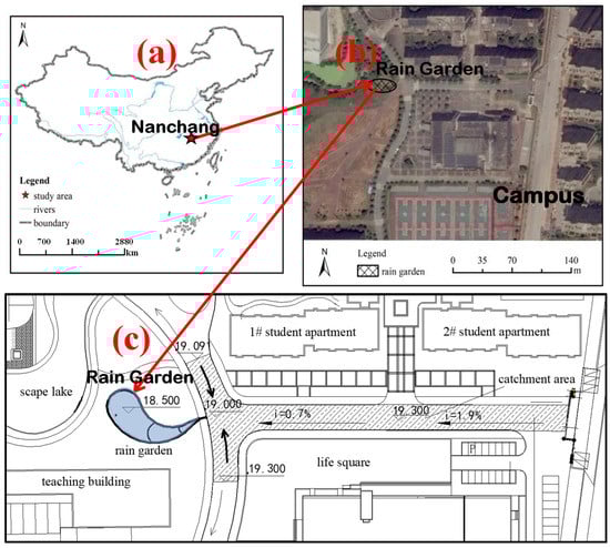 Location map of the rain garden (a) The location of Nanchang in China; (b) The location of the rain garden in Nanchang; (c) The location and surrounding schematic of the rain garden.
