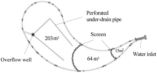 - The gravel drainage layer was 200 mm in depth. There were two perforated under-drain pipes, 150 mm in diameter with a drilling diameter of 15 mm to 20 mm [,]. The perforated pipes were used for the timely discharge of the filtered water. The particle size of the gravel was 20–30 mm, which was greater than the perforation aperture. The middle of the perforated under-drain pipe had a 100 mm-diameter silt riser, which was used to regularly remove sediment in the perforated under-drain pipe.