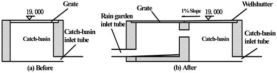 Inlet design is a critical part of a rain garden. When the road elevation is higher than the surface of the rain garden, road runoff would flow into the rain garden and be tested. For the Nanchang site, the minimum elevation of the catchment area was 19.0 m, where catch-basins were available to collect road runoff. After the transformation (Figure 4), when the rainfall was light, road runoff could be completely collected by the rain garden.