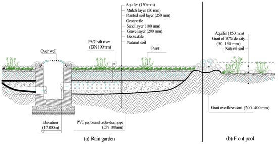 The rain garden had some specific design features that would enhance runoff infiltration and temporary storage in underlying soil layers, which would help reduce both the total runoff volume and its peak flow [,]. As the elevation of the landscape lake was 17.65 m, which was 1.35 m lower than the inlet. It was necessary to strictly control the structural thickness of the rain garden. Details of the design features are shown in Figure 5. It should be noted that the design of the rain garden requires attention to the following points.