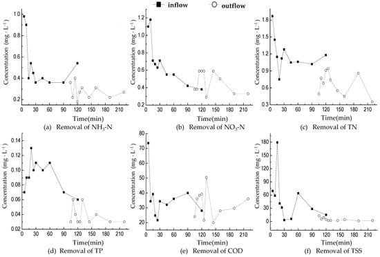 As shown in Figure 6, the concentration of pollutants varies with rainfall time and showed some common characteristics, and each concentration of inflow pollutants decreased with rainfall duration and finally tended to flatten out, which was due to the initial scouring effect. The concentrations of these pollutants were higher before inflow in the early 20 min, and the pollution of rain water was more serious at the initial stage. The pollutant load was always heavy in the initial stage of the runoff []. There were significant fluctuations in the concentration of outflow pollutants except for TSS, which was due to different degrees of the initial scouring effect of different pollutants []. The fluctuations in the outflow were generally lower than those in the inflow.