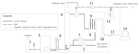 Ozonation experiment equipment online monitoring system diagram (1—oxygen cylinder; 2—gas flow meter; 3—ozone generator; 4—gas phase ozone concentration meter (in); 5—microporous aeration plate; 6—ozone contact oxidation tower; 7—pump; 8—constant flow meter; 9—pH, ORP, liquid phase ozone sensor; 10—pH, ORP, liquid phase ozone transmitter; 11—gas phase ozone concentration meter (out); 12—KI tail gas absorption bottle; 13—data acquisition module; 14—computer).
