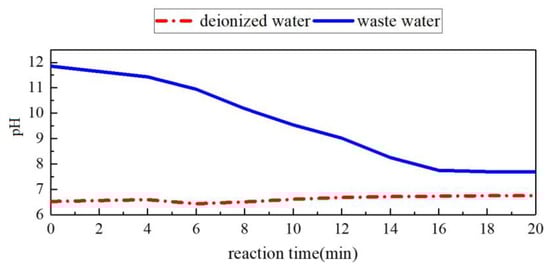 For the wastewater-based reaction system, NaOH is used to adjust the pH from 8.10 to 11.85 at the beginning of the experiment. In the first 16 min, pH decreases rapidly as the reaction proceeds until it decreases to 7.60 and then stabilizes. As the reaction proceeds, hydroxide ions trigger the decomposition of ozone, and the reaction is shown in Equation (2).