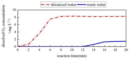 The change in ozone dissolved in water is shown in Figure 4. When ozone is added to deionized water, the concentration of ozone in water rapidly increases from 0 to 8.20 mg·L−1. In the first 6 min, the liquid phase ozone concentration increases rapidly and then reaches a stable state. This result is consistent with the trend of ORP.