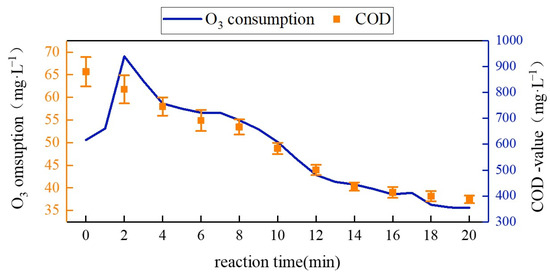 The online monitoring and data conversion system can be used to obtain the change in ozone consumption in the reaction through Equation (1), as shown in Figure 5. The overall change trends of COD and ozone consumption in the reaction are similar, and the overall trend shows a gradual decline with the reaction. At the beginning of the catalytic ozonation reaction, the ozone consumption increases sharply, with a maximum value of 69 mg·L−1, and gradually decreases with the progress of the reaction, with a minimum value of 36 mg·L−1. At the early stage of the reaction, the direct reaction and decomposition reaction of ozone with pollutants are carried out synchronously, and the consumption of ozone is large. At the later stage of the reaction, the direct reaction of ozone and the decomposition reaction with hydroxide are weakened, and the ozone consumed by the catalytic reaction is the main ozone consumption. The COD in the wastewater gradually decreases, the decrease trend becomes smooth after 14 min, and the minimum value is 387 mg·L−1, which meet the requirement of the Yeast Industry Water Pollutant Discharge Standard (GB25462-2010) that the COD is less than 400 mg·L−1.
