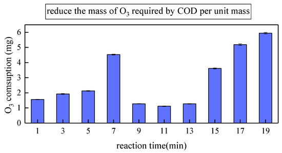 Every 2 min in the reaction is taken as a statistical stage, and the catalytic ozonation is divided into 10 stages on average. The utilization rate of ozone in each stage is shown in Figure 6. When the reaction time is less than 15 min, the utilization rate of ozone in the catalytic ozonation is very high. The average value of the ozone consumed by removing COD per unit mass is 1.97 mgO3·mgCOD−1. In the last five minutes of the reaction, the average value of ozone consumed by COD degradation is 4.91 mgO3·mgCOD−1.