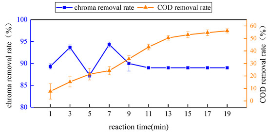 Figure 7 shows that the removal effect of chroma is clearly better than that of COD, but their change trends are the same. Moreover, the substance causing the chroma contributes to the measurement of COD. However, the degradation of pigment substances is only the change in molecular structure and has not been completely removed from the water as pollutants.