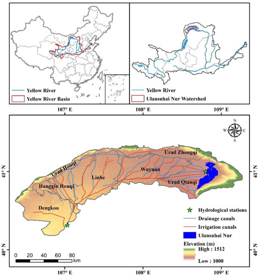 The Ulansuhai Nur watershed (UNW), extending from 105°12′ E to 109°53′ E longitude and from 40°13′ N to 42°28′ N latitude, is entirely in the administrative region of Bayannur City, Inner Mongolia Autonomous Region and is located in the middle reach of the Yellow River (Figure 1). The watershed mainly includes seven counties of Wuyuan (WY), Dengkou (DK), Linhe (LH), Hangjin Houqi (HH), Urad Zhongqi (UZ), Urad Houqi (UH), and Urad Qianqi (UQ), among which three counties of LH, HH, and WY are entirely located in the watershed. The Hetao Irrigation District, as the third largest irrigation district in China, is located in this watershed. The irrigated farmland area is approximately 5.74 × 103 km2, which occupies 41.3% of the watershed area. The main crops are spring wheat, corn, and sunflower. Approximately 5 × 109 m3 irrigation water (approximately 1.8 times of local precipitation amounts) was pumped annually from the Yellow River into irrigation canals at the DK county for regional social and economic development. The irrigation channel network is composed of drainage canals (red lines) and irrigation canals (blue lines) (Figure 1).