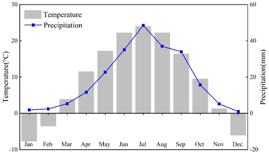 The watershed covers an area of 13,947 km2 and has a typical semi-arid continental climate that features a cold and dry climate, strong evaporation, and little precipitation. The annual mean temperature is 9.3 °C, and annual precipitation is 220.6 mm with 70.1% of rainfall occurring from June to September during the period of 2005–2019 (Figure 2). Annual evaporation is 2100–2300 mm, which is more than 10 times the precipitation [24]. The industrial wastewater, domestic sewage, and farmland drainage water travel through the watershed from west to east by means of the drainage canals, flow into the Ulansuhai Nur Lake (UNL), and eventually enter into the Yellow River [28]. The UNL, as the largest freshwater lake in the Yellow River basin, performs an important ecological function for the regional ecological environment. In recent decades, the gradual deterioration of water quality in the UNL poses a great threat to water resources security for downstream cities of the Yellow River [29].