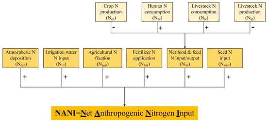 where NANI is the total net anthropogenic nitrogen input, NANIirri is the nitrogen input through the irrigation water, NANIland is N input through land phase, the Ndep refers to atmospheric N deposition, Nfert means chemical N fertilizer application, Ncrop represents crop N fixation, Nim is net food/feed N import, Nseed refers to seed N input, and Nirri means irrigation N input. The Nim was determined by the difference between the sum of N consumption from human and livestock and the sum of the N content in livestock and crop products as follows [34].