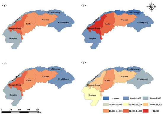 Necessary data, such as the sown area, human and livestock populations, crop yields, chemical fertilizer application amount, atmospheric nitrogen deposition, irrigation water amount and total nitrogen concentration at the Sanshenggong hydrological station, were adopted for the calculation of watershed NANI (Figures S1–S4). The raster data of atmospheric nitrogen deposition during 2005–2015 were obtained from Regional Emission inventory in Asia version 3 (REASv3) with a spatial resolution of 0.25° [35] and could be download at https://www.nies.go.jp/REAS/index.html (accessed on 1 October 2022). The remaining data sources were acquired at the county scale from regional Statistical Yearbooks. Watershed NANI budget was equal to the sum of NANI budgets in each county of the study area, which was quantified by summing up the values of different NANI components in the specific county. During the calculation process, the land use weighting method was used to convert NANI values at the county level to the watershed level [36]. The land cover data in 2000 and 2010 with a 30 m resolution (http://www.globeland30.com accessed on 1 October 2022) were adopted in this study [37].