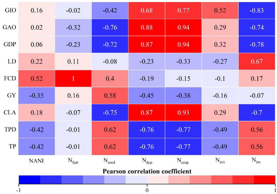 Pearson correlation coefficients between NANI and its components and economic, agricultural, and social factors.