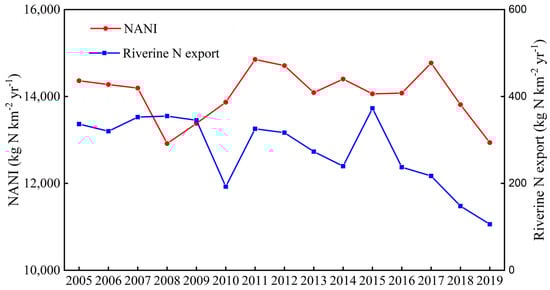 Temporal variations in the riverine N export and NANI in the UNW from 2005 to 2019.
