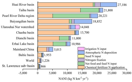 Quantitative assessment of anthropogenic N inputs and identification of the dominant component are critical for watershed N pollution control [6]. It has been documented that anthropogenic N inputs vary widely at different watersheds or regions influenced by anthropogenic activities [9]. As indicated in Figure 8, annual average NANI value in the UNW during the period of 2005–2019 was 14,048.0 kg N km−2 yr−1, which was significantly higher than the average values of 1226.0 kg N km−2 yr−1 in the world [50] and of 5013.0 kg N km−2 yr−1 in mainland China [31]. At the watershed scale, the NANI value in the UNW was lower than in some watersheds, such as 27,186.0 kg N km−2 yr−1 from 2003 to 2010 in the Huai River watershed of central China, 21,800.0 kg N km−2 yr−1 from 2000 to 2010 in the Taihu basin [51], 20,221.0 kg N km−2 yr−1 from 2008 to 2016 in the Pearl River Delta region [16], and 18,852.0 kg N km−2 yr−1 in 2015 in the Baiyangdian basin in northern China [22]. However, the NANI value in the UNW was far higher than other basins worldwide [11,13,19,40,51,52]. For example, the NANI value in the UNW is far higher than that of 1953 kg N km−2 yr−1 in 2010 in the St. Lawrence sub-basin in Canada [11] and 7736 kg N km−2 yr−1 in 2013 in the Poyang Lake basin in China [53]. The dominant sources of N in different areas are different (Figure 8). Numerous studies have found that chemical N fertilizer, and net import of food and feed are two major components of the NANI. According to whether the agroecosystem in the watershed is heterotrophic or autotrophic, the watershed types are divided into the agricultural watershed and urban watershed [9]. Agricultural watersheds represent the net export of N in crop products, which are supported by large inputs of chemical N fertilizer, such as the Baltic basin [14], the Mississippi basin [54], and the Huai River basin [6]. Urban watersheds need imported food and feed, which are supplied for large urban populations, such as Pearl River Delta region [16]. As for the NUW, the chemical N fertilizer in the UNW was the major contributor to watershed NANI and accounted for 75.4% of watershed NANI, which was higher than that of other watersheds worldwide except for the Chaohu basin (Figure 8). The UNW is the important agricultural and animal husbandry base in China, and the agriculture and animal husbandry in the watershed was the main industry, accounting for 35.2% of local GDP.