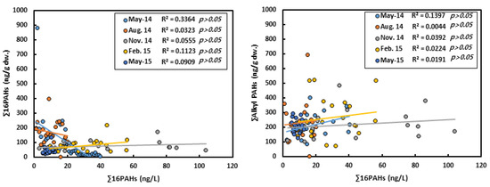 In the previous study, higher PAH concentrations in surface seawater and suspended particulate matter (SPM) were reported than in sediment [33]. Contrary to this, ∑ 16 PAH levels in the surface seawater (average 31.5 ng/L) showed four orders of magnitude lower than the level in the surface sediment (average 107.9 ng/g dw.). The levels of seawater and sediment did not show a statistically significant correlation in each sampling time (p-value > 0.50, Pearson correlation analysis) (Figure 3).