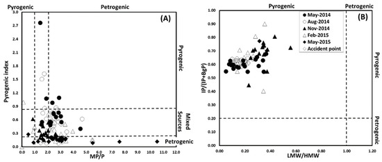 Plots of calculated (A) MP/P versus pyrognic index. (B) LMW/HMW versus IP/(IP + BgP) index(LMW/HMW - Pyrogenic Origin : < 1, Petrogenic Origin : >1; IP/IP+BgP - Pyrogenic Origin : > 0.2, Petrogenic Origin : <0.2; MP/P - Pyrogenic Origin : < 1, Petrogenic Origin : > 2; Pyrogenic index - Pyrogenic Origin : > 0.8, Petrogenic Origin : < 0.223).