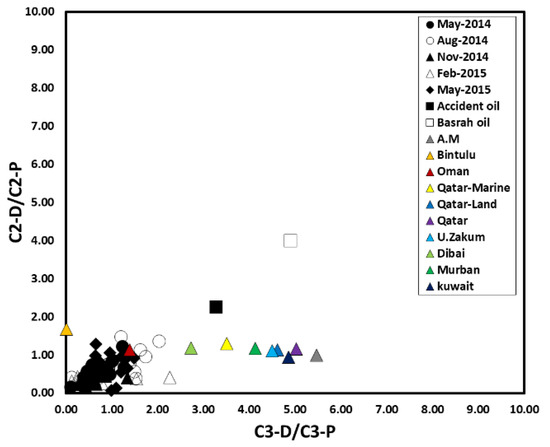 The double ratios of C2-D/C2-P were in the range of 0.11–2.26 and those of C3-D/C3-P were in the range of 0.08–1.48 in the water in and around the oil spill and were consistent throughout whole stations. These values were similar to the results of the analysis of double ratios for the intertidal sediment samples on the Yeosu and Namhaedo coasts after the Wu Yi San oil spill accident [23]. The double ratios of the oil collected from the water 5 days after the accident and those of the Iraqi Basrah spill present in the oil pipeline were expected to be identical with similar values, but they showed a different trend from the double ratios obtained in this study. As they were similar to the double ratios of samples from the stations near the oil spill, it is possible that the level before the accident was restored. In addition, data from existing literature [21] that analyzed the double ratios of C2-D/C2-P and C3-D/C3-P for 14 representative types of crude oil imported into South Korea were applied to the data in this study. According to the results (Figure 5), a station where the double ratios of C2-D/C2-P and C3-D/C3-P were similar to the double ratios of C2-D/C2-P and C3-D/C3-P in Oman Oil was found, but it should be further investigated as this station was not near the oil spill of interest.