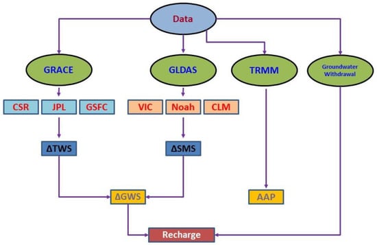 Due to the absence of precipitation records from ground stations, we constructed a monthly time series of rainfall and annual average precipitation (AAP) from Tropical Rainfall Measuring Mission (TRMM) satellite data. The AAP rate was determined by arithmetically averaging the monthly rainfall data for a year. In this study, we used it to learn more about how precipitation affected the ΔGWS over the course of the experiment’s time frame. Figure 2 illustrates the methods of the study.