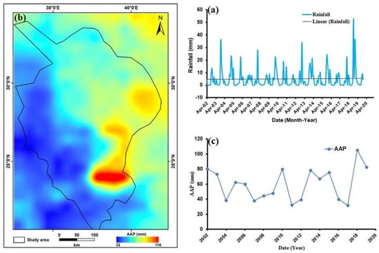 In Figure 3a, the monthly precipitation rate is plotted, with greater values between October and April and decreasing values between May and September. Higher values of approximately 116 mm can be observed in the northeastern part of the wadi from the AAP map (Figure 3b), whereas lower values can be seen up to 30 mm in the southwestern parts. According to Figure 3c, an annual rainfall time series, 2018 had the highest rate (105 mm), whereas 2004, 2007, 2011, 2012, 2016, and 2017 had the lowest rate (<40 mm). The AAP rate was estimated to be 60 mm for the study region throughout the period (2002–2019), reflecting that the study region is dry.