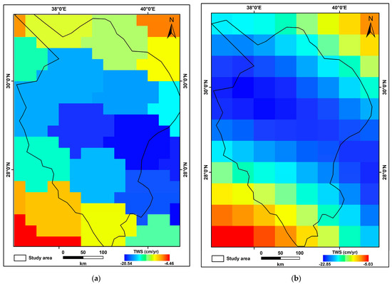 Figure 4 illustrates the spatial distribution of the secular ΔTWS trends calculated from CSR and GFCF solutions from 2002 to 2021. Figure 4 indicates that the ΔTWS trend shows higher negative values varying between −20.5 and −22.9 mm/yr along the mainstream and the southeastern part of the wadi using CSR and GFCF datasets, respectively. The ΔTWS trend values are increasing towards the northeast and southwest directions reaching values varying between −5.5 and −4.5 mm/yr.