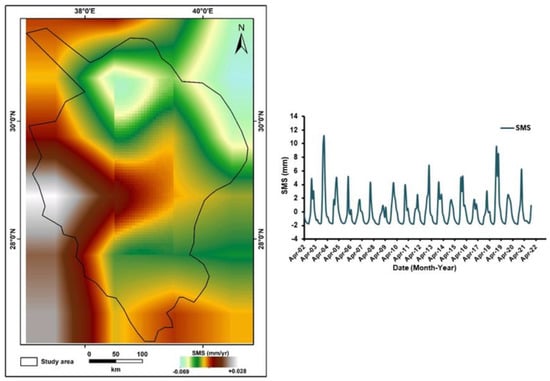 Spatiotemporal distribution and the monthly time series of the SMS trend for the entire study area.