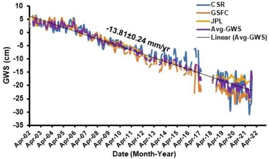 By deducting the GLDAS-extracted ΔSMS storage from the GRACE-extracted ΔTWS, the ΔGWS was calculated using Equation (1). Similar to the ΔTWS, the ΔGWS (Figure 7) demonstrates greater values between October and April and lower values between May and September. CSR, JPL, and GFCF each provide estimates for the rate of change in GWS, with their averaging rate of −13.81 ± 0.24 mm/yr (Table 1; Figure 7).