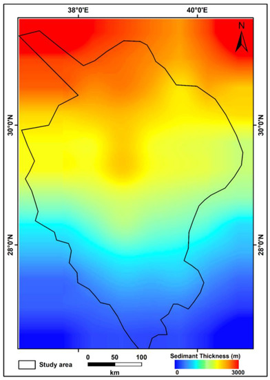 Sediment thickness data were made available for download from the NOAA National Geophysical Data Center [73]. Figure 9 illustrates that the sediment thickness in the southern half of the research area increases from about 0.0 m at the southern Pre-Cambrian and Quaternary Tertiary volcanic outcrops to about 3000 m at its northern downstream, close to the Jordanian/Saudi border. This higher sediment thickness across the northern part of the country might indicate the higher groundwater reserves in the Wadi. The graben complex with a higher vertical displacement of up to 1500 m accounts for the larger sediment thickness in the wadi’s central region [39,66], delimited by significant faults from the east and west. The Wadi As-Sirhan Basin is made up of depressions that are filled with sediments that range in age from the Devonian to the Neogene, including Quaternary basalt, alluvial sediments, gravels, and silt and clay that have been evaporite mineral-cemented [63].