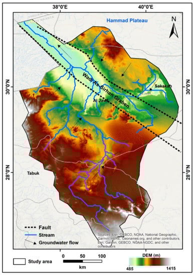 The Wadi As-Sirhan drainage basin is located in the northwest of Saudi Arabia, about 1000 km north of Jeddah. It is located between 26.25° and 31.77° N latitude, and 37° and 41° E longitude (Figure 1). It includes Saudi Arabia’s western border with the Hashemite Kingdom of Jordan.