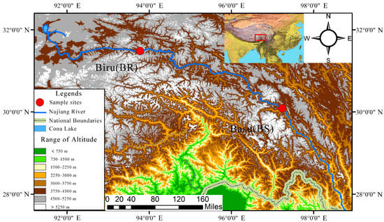 Fish were collected from 2 localities along the Nujiang River (Figure 1). Basu (BS) was chosen as the low-altitude site with coordinates of 30.09977° N and 97.23578° E and an elevation of 2100 m. Biru (BR) was chosen as the high-altitude site with coordinates of 31.4878° N and 93.77231° E with an elevation of 3890 m. Under the authorization of the fisheries departments of the Chinese government, we sampled S. nukiangensis in September and October 2020. We selected six S. nukiangensis with around 150 g weight and a healthy, symmetrical appearance at each site. After fish were anesthetized by 100 mg/L Tricaine methanesulfonate (MS-222, Sigma, St. Louis, MO, USA), the liver tissues were immediately placed into enzyme-free 1.5 mL EP tubes and subsequently frozen in liquid nitrogen. All tubes were kept at −80 °C until metabolite extraction.