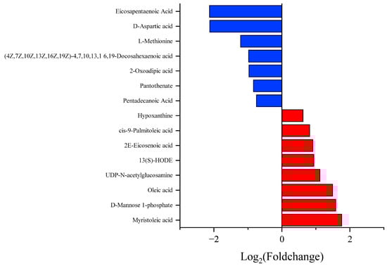 However, the high-altitude group had higher levels of monounsaturated fatty acids, including oleic acid (C18:1) and myristoleic acid (C14:1). These outcomes differed from those of EPA, DHA and pentadecanoic acid. Some research revealed that toxicity and disease may affect organic oleic acid content [,]. Myristoleic acid is uncommon in nature, with limited research on its content in fish. However, it was confirmed to have antibiofilm and antimicrobial activities []. Numerous dietary and hormonal signals can affect stearoyl-CoA desaturase and then alter lipid metabolism []. Combining the results of high monounsaturated fatty acids, low pentadecanoic acid and low temperature in high altitude, we hypothesized that food and temperature may be the primary factors impacting their intake and metabolism in environments of varying altitudes.