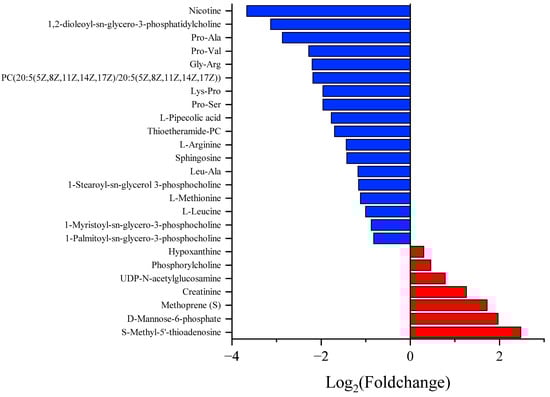 According to the principal component analysis, the high-altitude and low-altitude groups were obviously distinct (Figure S1). OPLS-DA modeling could separate all samples into two distinct groups based on different altitudes as well (Figure S2). In S. nukiangensis liver, 25 metabolites showed lower relative abundance, and 8 metabolites showed higher relative abundance in BR compared with BS.