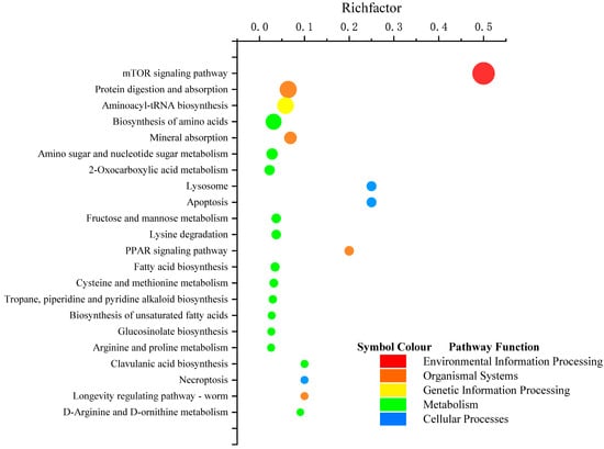 The KEGG database (https://www.kegg.jp/ (accessed on 21 September 2022)) was utilized to assess the KEGG pathway after screening the significantly differential metabolites to discover the enriched biological processes. As shown in Figure 4, the main metabolic pathways were the mTOR signaling pathway, protein digestion and absorption, aminoacyl-tRNA biosynthesis, biosynthesis of amino acids, PPAR signaling pathway and so on. Lysosome and apoptosis were the most enriched pathways for cellular processes.