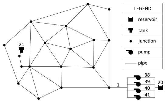 Savic et al. [] developed a pump scheduling methodology using GA as optimization algorithm and assigning an operation pattern to each pump. In addition to a pattern time-step equal to 1 h, with decision variables assuming the value 0 or 1 for each pattern time-step for each pump, these authors also considered constraint Equations (2)–(4) on the water level in the tank as well as a constraint on the flow that each combination of the pumps can deliver, which is a function of the pump characteristics and the tank water level. They applied the methodology to the case study first analyzed by [], and subsequently modified by [], by doubling the original base demand. The WDN is a version of the network usually called Anytown, which consists of 37 pipes, 19 nodes, 1 tank (node 21) and 1 source (node 20). Four pumps are installed at the source, as shown in the network model in Figure 1. The tank elevation and diameter are 215 ft and 40 ft, respectively, with the tank level being the variable between the minimum of 7 ft and the maximum of 35 ft. The energy cost is 0.0244 $/kWh from 00:00 to 07:00 h and 0.1194 $/kWh from 07:00 to 24:00 h. Each pump has its head-discharge curve and efficiency curve. The hydraulic time-step (Δth) is assumed equal to 1 h.