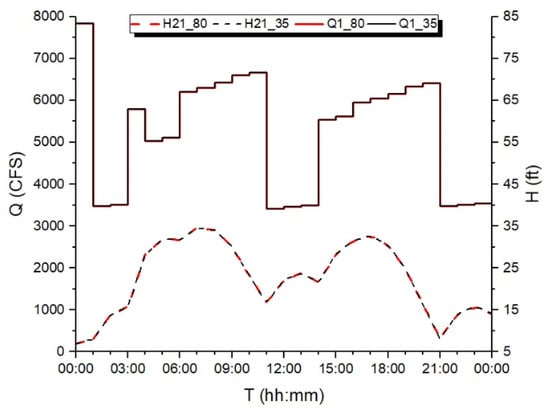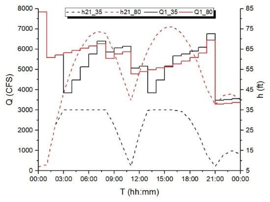 In order to assess the effectiveness and reliability of the solution, the optimal pattern resulting from the optimization algorithm was assigned to a new WDN having the same characteristics as the original one except for the maximum tank water level, which is assumed equal to 80 ft. This constraint, using the optimization algorithm-derived pattern, was satisfied (maximum level in the tank was 35 ft), as plotted in Figure 2. In theory, the operation of the system should remain unaltered by this change since it only affects the maximum allowable water level of the tank. Nevertheless, in actual fact the change is found to significantly alter system operation: Figure 2 shows the flow through conduit 1 (Q1_80) and the water level in the Tank 21 (H21_80) being significantly different from the original values (Q1_35 and H21_35). In particular, the tank water level far exceeds the real maximum allowable level (35 ft), reaching the value of 76.1 ft. This example shows the operation pattern determined to be the optimal solution, actually failing to bring about the expected system behavior. From an analytical perspective, the constraint Equation (3) is not satisfied, which would cause the overflow of water from the tank.