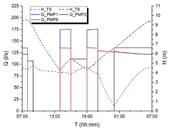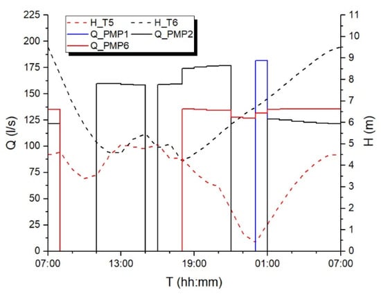 In order to test the feasibility of proposed approach, the hydraulic time-step was reduced from 1 h to 10 s. The results of flow discharge ran through the pumps (Q_PMP1, Q_PMP2 and Q_PMP6) and water levels in the tanks (H_T5 and H_T6) coincided with that obtained considering a time-step of 1 h (Figure 8) therefore showing the reliability of the solution.