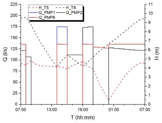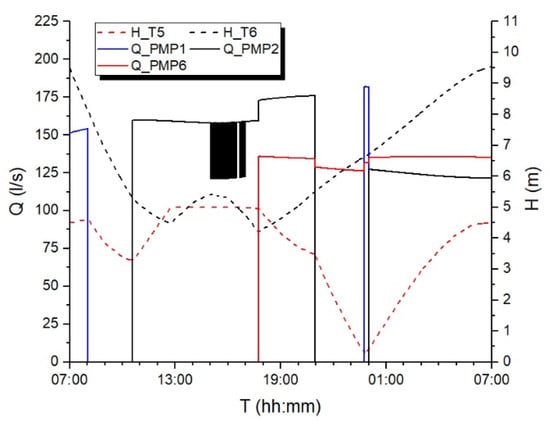 The simulation shows (Figure 5) that in the time interval from 15:00 to 17:00 h, PMP2 is the only operating pump, with a continuously varying pumped flow. That occurs because the level of tank T5 reaches the maximum (5.0 m) and Epanet2 automatically closes the pipe supplying tank T5, being unable to simulate a tank overflow. Consequently, the flow continuously switches between a high value (i.e., the flow required to supply tank T5 and satisfy nodal demands) and a low value (i.e., the flow required to satisfy nodal demands). In real operation, the tank T5 would overflow, since pump PMP2 operates according to trigger-based rules at tank T6. It was found that the optimal operation of pump PMP2 provides for 5.3 m at tank T6 as on-trigger level and 5.5 m as off-trigger level. Because at 15:00 h the water level at tank T6 is 5.42 m and reduces progressively thereafter, pump PMP2 continues operating, and stops only at 20:57 h, when the increasing water level reaches 5.3 m.