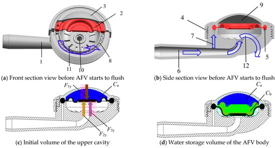 As the amount of water in the upper cavity gradually increases, the elastic diaphragm gradually moves downwards under the resultant force in the vertical direction (Fy) (Equation (4)). Fy is composed of the upper cavity water pressure (F1y) (Equation (1)), the lower cavity water pressure (F2y) (Equation (2)), and the elastic force of the elastic diaphragm (F3y) (Equation (3)). Since the Fy is greater than zero, the Ha (inlet pressure at the beginning of flushing for the AFV to automatically close) can be calculated in Equation (5).