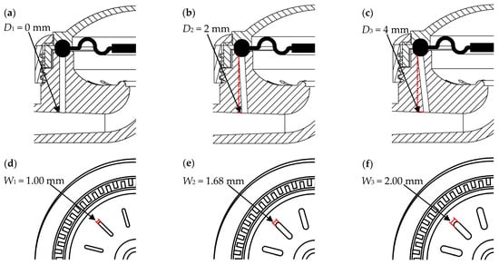 Referring to the research results of Zhao et al. and Mo et al. [23,24], E is set to a total of three levels, 40, 55, and 60 HA, D is set to a total of three levels, 0, 2, and 4 mm (Figure 2a–c), and W is set to a total of three levels, 1, 1.68, and 2 mm (Figure 2d–f). The experiment is designed using orthogonal experimental Table L9 (33), and the experimental design is shown in Table 1. The elastic diaphragm hardness test is carried out using a Shore durometer on the “A” scale. The range of Shore durometer (Yueqing Handpi Instrument Co., Ltd., Zhejiang, China) is 0–100 HA with an accuracy of 0.5 grade.