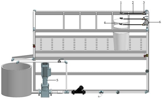 Schematic diagram of the hydraulic experimental platform of the AFV. 1. Automatic flushing valve; 2. PE pipe; 3. ball valve; 4. bucket; 5. centrifugal pump; and 6. pressure gauge.