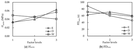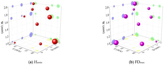The trend diagram of factors and experimental indexes with the experimental factors as horizontal coordinates and the experimental indexes as vertical coordinates is shown in Figure 5. Hamin is positively correlated with E and D and negatively correlated with W. FDmax is negatively correlated with E and W and shows a trend of increasing and then decreasing with D. When E is reduced from 60 HA to 40 HA, the reduction of Hamin is 42.1% and the increase of FDmax is 91.4%; when D is reduced from 4 mm to 0 mm, the reduction of Hamin is 47.6% and the increase of FDmax is 3.5%; and when W is increased from 1 mm to 2 mm, the reduction of Hamin is 16.3%, at which time FDmax decreases by 18.7%.