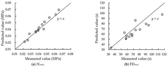 Within the range of factors and level parameters in Table 1, this paper additionally processes 15 different specifications of AFVs for hydraulic performance experimentation, and the measured results and the predicted results from Equations (9) and (10) are shown in Table 5 and Figure 6. The relative errors between the measured and predicted values of Hamin and FDmax are −12.2% to 19.0% and −18.4% to 18.3%, respectively, with a small root mean square error (RMSE) of 0.003 MPa and 10.2 s, respectively, and the normalized root mean square error (nRMSE) is 8.0% and 14.5%, respectively, both less than 20%. The range analysis results show that the combination with the smallest Hamin result is E1D1W3 and the combination with the largest FDmax is E1D2W1. As shown in Table 5, the measured Hamin of E1D1W3 is 0.022 MPa, and the measured FDmax of E1D2W1 is 116.4 s, which are lower and larger than the values in Table 2, respectively. The regression Equations (9) and (10) can be used to predict the combination of AFV elastic diaphragm hardness and structural parameters corresponding to Hamin and FDmax required for the actual project and can shorten the development time.