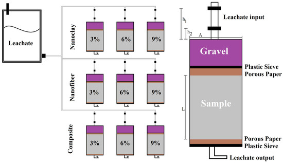 The permeability tests were performed on selected samples from the mentioned groups based on ASTM instructions [37]. In this regard, the samples after preparations were filled with compacted soil mixed with nanofiber and nanoclay particles. The cell was installed in a standard constant-head permeability test device, and to avoid the washed-away problem, porous papers were used at the top and bottom of the cell. Additionally, cleaned gravel was used in the top of the cell in a thin layer in order to prevent swelling and help the flow of leachate in the cell. Figure 4 illustrates the scheme of the permeability tests conducted on the different group of mixtures. The leachate was collected in the output point after passing through the filters and samples which were used for the calculation of permeability by using the following equation [33]: