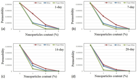 Permeability of studied samples in different groups (unit is cm/s): (a) 1-day, (b) 7-day, (c) 14-day, (d) 28-day.