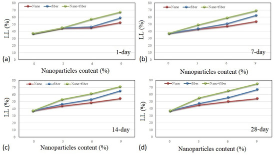 Liquid limit results were measured for different groups of the samples: (a) 1-day, (b) 7-day, (c) 14-day, (d) 28-day.