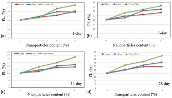 Plasticity index results were measured for different groups of the samples: (a) 1-day, (b) 7-day, (c) 14-day, (d) 28-day.