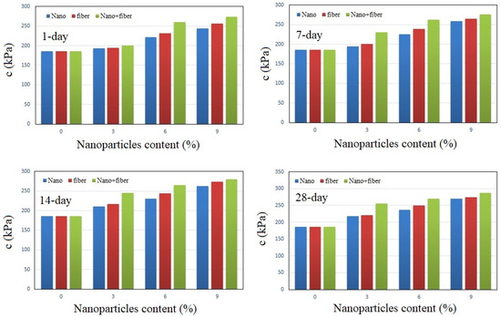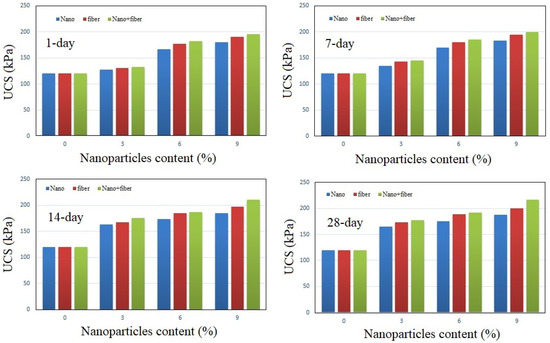 - UCS and c increase when increasing the type and amount of additives in soil, while φ has not shown the significant action of variations. Results show that the nanoclay–nanofiber composite has provided good improvements in soil durability, with increased UCS from 120 kPa to 220 kPa after a 28-day waiting period. It increased c from 185 kPa to 288 kPa as well.