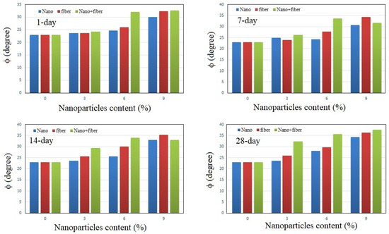The UCS and direct-shear were used to investigate the strength parameter variations of mixed soils. The UCS, c and φ are the index strength parameters that represent the mechanical properties of the fine-grained soil regarding durability. These mechanical properties were estimated for studied samples in different groups and presented in Figure 9, Figure 10 and Figure 11. According to Figure 9, the UCS measured for the main soil (control group) was 120 kPa which became 188 kPa in the nanoclay group; 200 kPa in the nanofiber group, and 216 kPa in the nanoclay–nanofiber composite after a 28-day waiting period. These changes indicated that using the nanofiber mixture increased the UCS more than the nanoclay mixture and the composite mixture showed improvement. Therefore, the UCS is modified using a nanofiber mixture in samples, but the composite mixture reaches the highest rate of UCS. It can be concluded that nanoclay–nanofiber composite application significantly improve UCS and the durability of the soil. Figure 10 and Figure 11 show the c and φ changes in the nanoclay, nanofiber, and composite groups. As seen in this figure, the variation of the various mixtures in the φ does not show a visible change, but c has shown an increase with the increase in waiting time and additives. In the nanoclay group, the c has reached 185 kPa to 270 kPa. In the nanofiber group, it reached 275, and in the composite group, it hit 288 kPa. Regarding the obtained results, the nanoclay–nanofiber composite has provided good improvements in soil durability which can be considered an appropriate alternative to modify landfill liners.